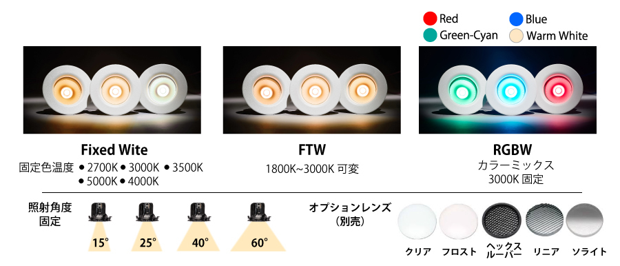 Navis ラインには、白色タイプと RGBW カラーミックスタイプを用意してます。 白色の固定色温度には、2700 K、3000 K、3500 K、4000 K、5000 K があります。3000 K バージョンでは、白熱光源が暗くなるとレッドシフトを美しく模倣できる照明器具のFade to Warmテクノロジーが利用可能です。