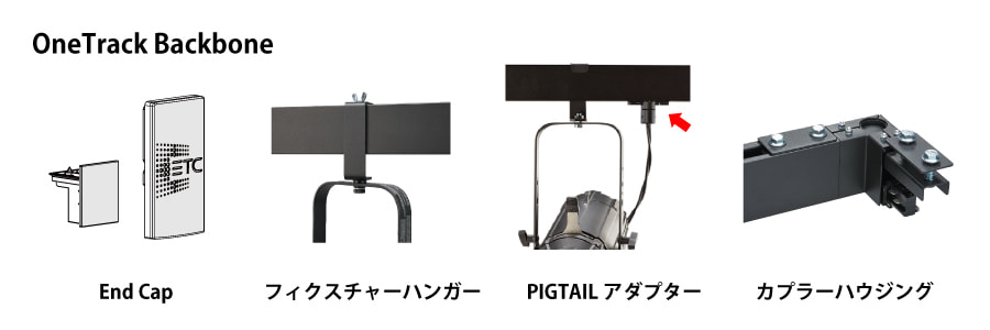 OneTrack BackboneにはOneTrack専用灯具以外の灯具を使用できますか? | 使用可能です。ダボの代わりに灯具のアーム部分に取り付ける「Backbone用フィクスチャーハンガーブラケット(以下、FHB)」は、45kgまでの灯具に利用可能です(※注:FHBは、ムービングライトなどのオートメーション機能を持つ灯具での使用を意図して製作されたものではありません)。非常灯としての役割を持つ灯具には、勝手に取り外しや移動を出来ないようにする仕様の「FHB」もお選びいただけます。「FHB」を使用する場合、「OneTrack」から灯具へ電源とデータ信号を供給するための「ピッグテール・アダプター」を使用します。「ピッグテール・アダプター(ケーブル長 約50cm )」には、以下の種類があります: 1) 電源(POWERCONDMX5XLR)と(5ピンXLR) 2) 電源(TRUE1 TOPDMX5XLR)と(5ピンXLR) 3) 電源(TRUE1 TOPDMX)のみ *ワイヤレス受信機内蔵の灯具などに使用 |