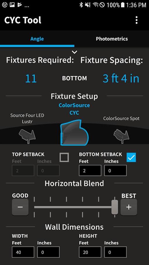 | CYCアダプターをご利用の場合に大変便利なアプリケーションのご案内です。 設置条件を入力すると、適性角度と設置台数が計算できる便利な無料スマートフォンアプリケーションです。カラーソースサイク、CYCアダプターを取り付けたソースフォーLEDやカラーソーススポットで、美しくホリゾントを染めるお手伝いをぜひ「CYC Tool」にお任せください。