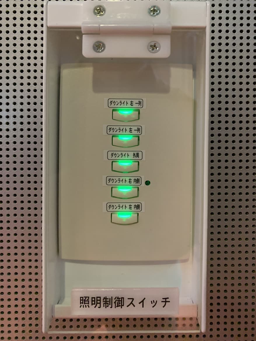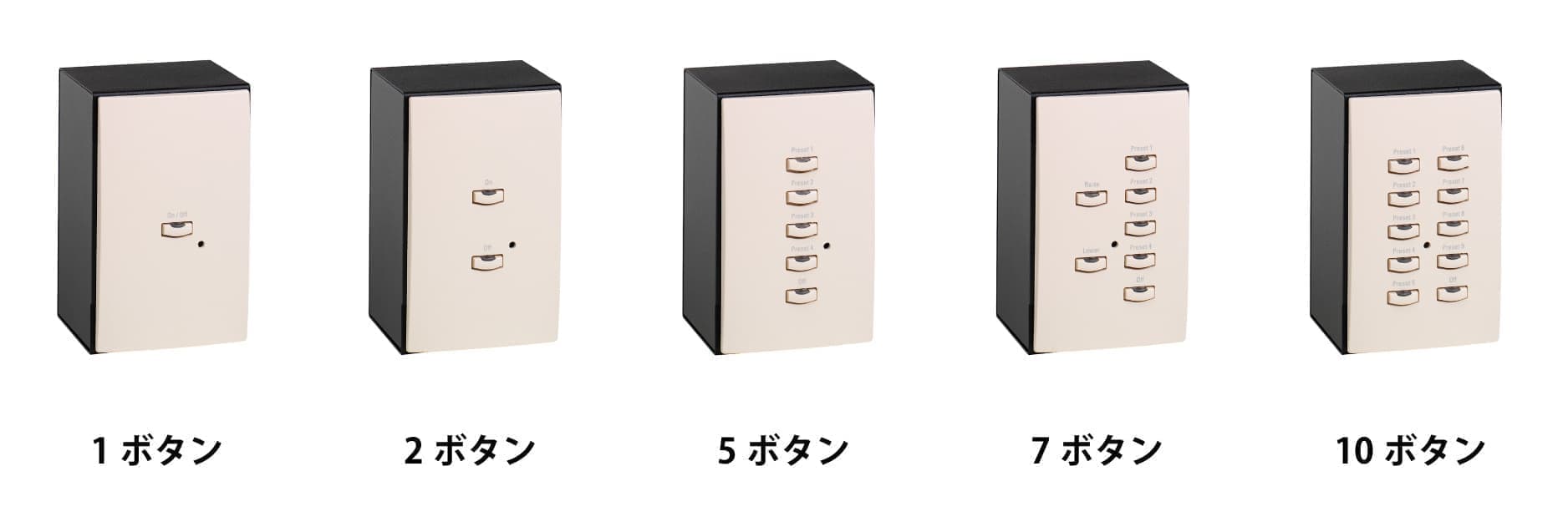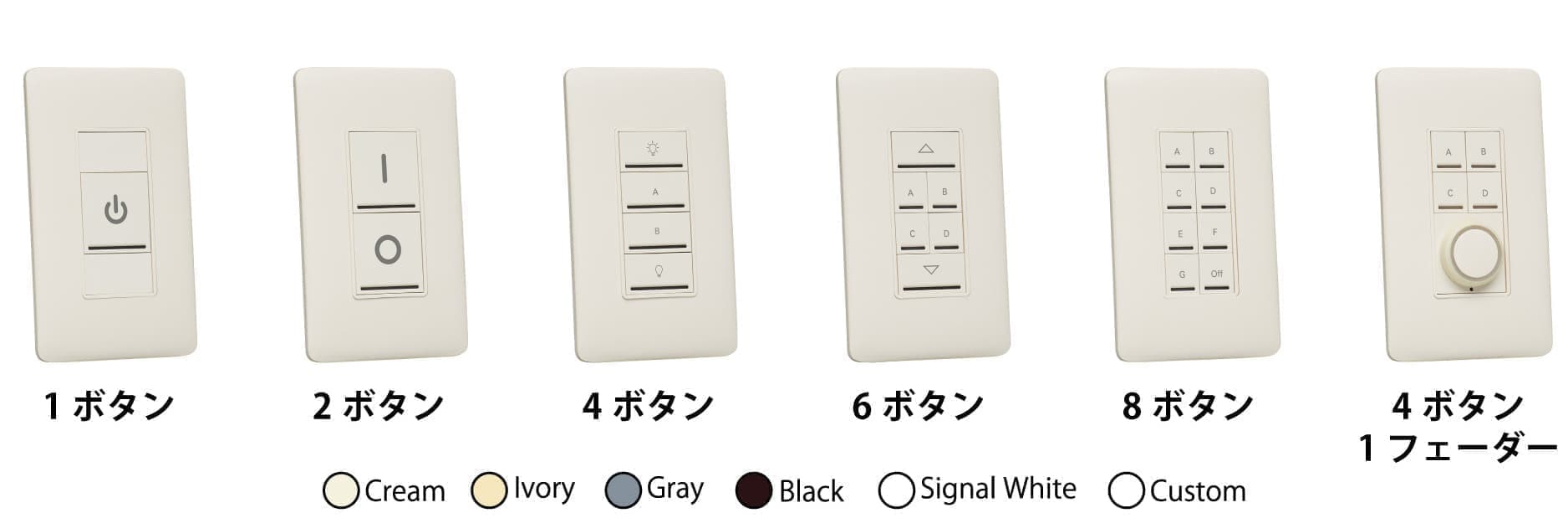 スイッチボックス1個幅のスタイリッシュなボディに6種類のボタン構成からお選びいただけます。