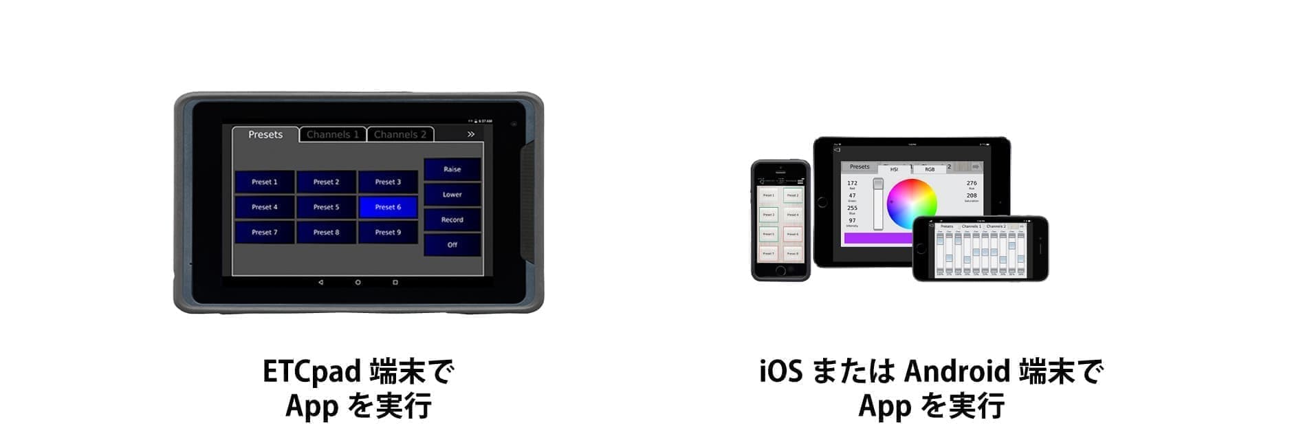 専用タブレット「ETCpad」や専用アプリをインストールしたスマートフォンなどを利用し、Wi-Fi経由でParadigmの制御を行うことができます。