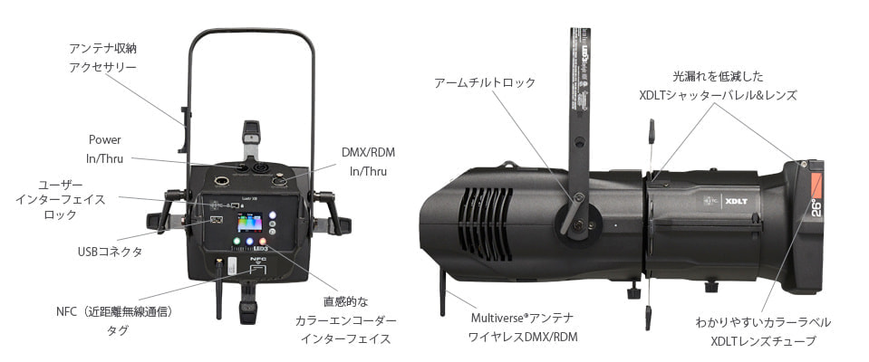 固定レンズシャッターバレルに取付 固定角度のレンズチューブを装着する事で、あらゆる設置場所やポジションでもその明るさと順応性を活かし、ロングスローや前明かりなど多様なライティングツールとしてご利用頂けます。 Source Four XDLTレンズ 5°、10°、14°、19°、26°、36°、50°、70° Source Four EDLTレンズ 19°、26°、36°、50° Source Four LED専用レンズ 50° Source Four 通常レンズ 5°、10°、14°、19°、26°、36°、50°、70°、90° |